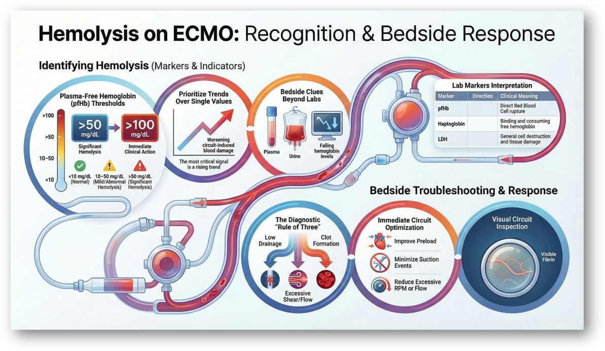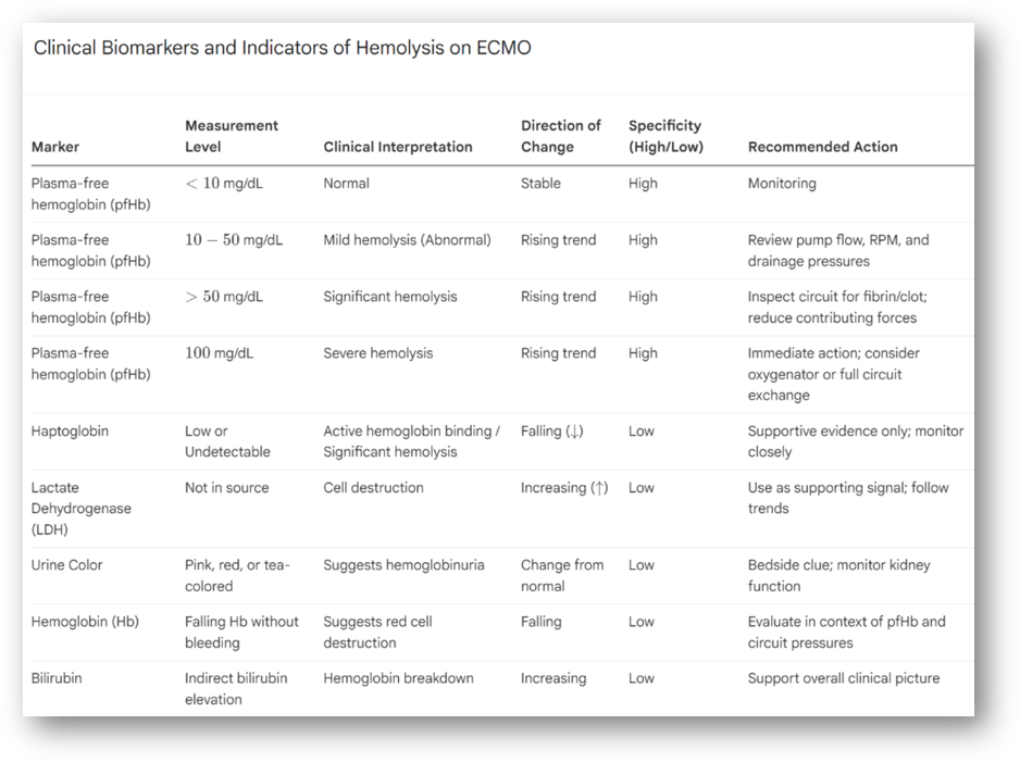 I understood the basics of hemolysis on ECMO. Watch for rising plasma-free hemoglobin, clots, and high negative inlet pressures.