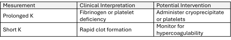 What it measures: Time from R to reach 20 mm clot strength (speed in time it took to get to 20mm clot strength)