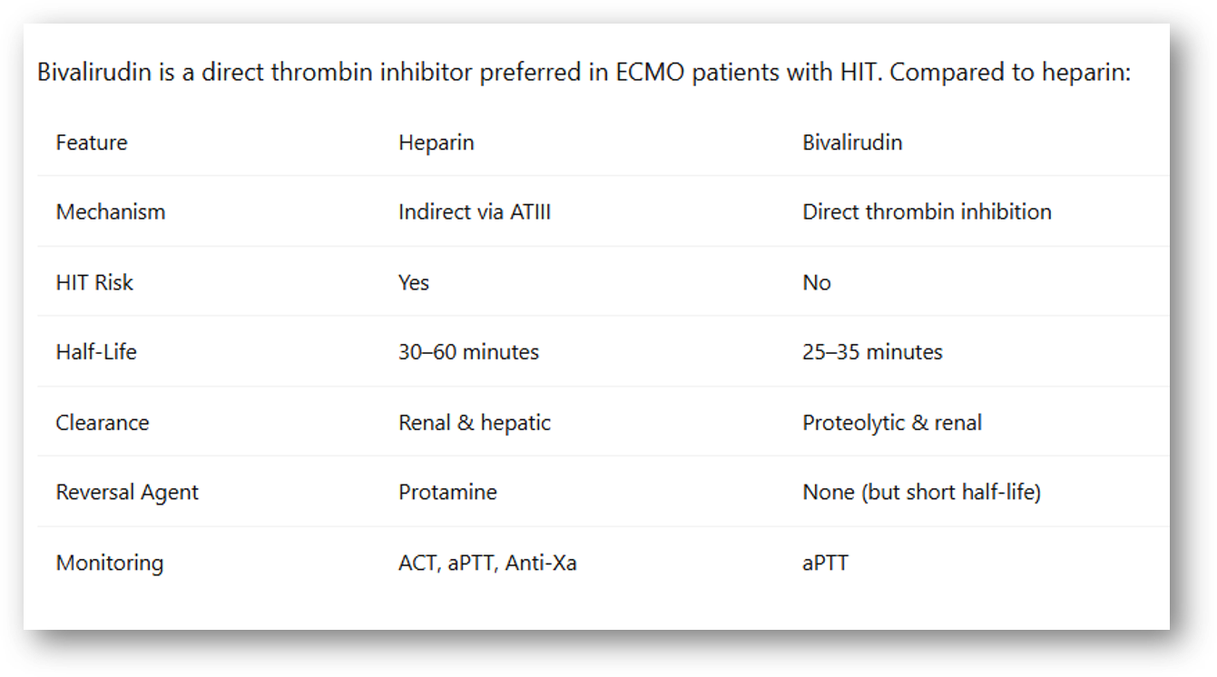 Bivalirudin’s stable pharmacokinetics and non-dependence on antithrombin make it ideal for ECMO, especially in unstable patients or when HIT is confirmed or suspected.