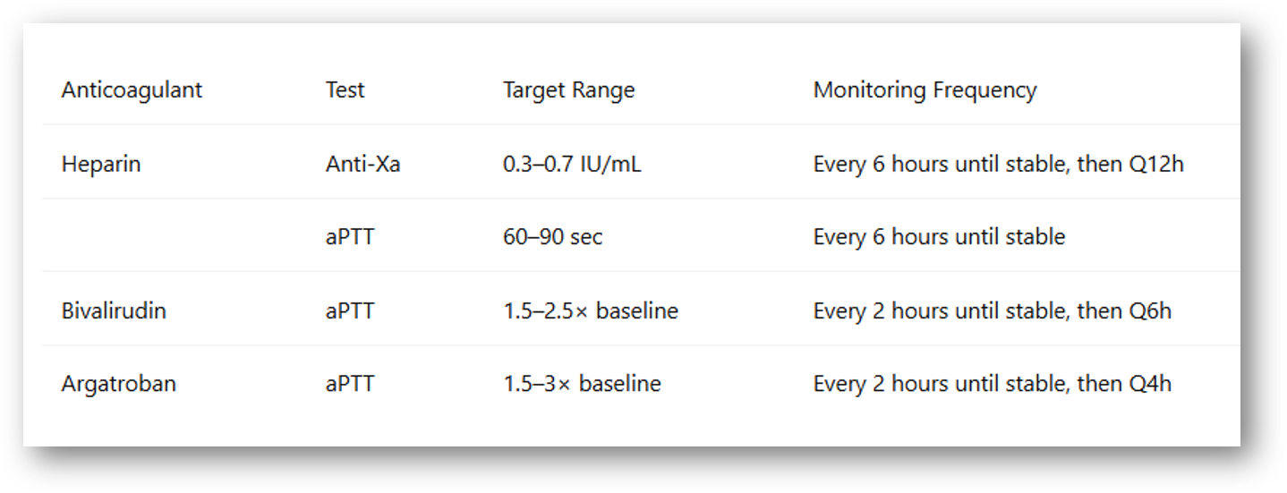 Match the anticoagulant to the right test: Anti-Xa for heparin, aPTT for bivalirudin/argatroban.